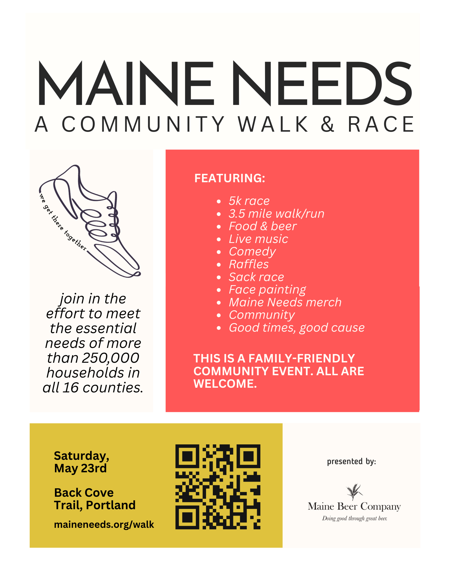All proceeds will go to Maine Needs to help support our mission of providing basic material goods for individuals and families throughout Maine.